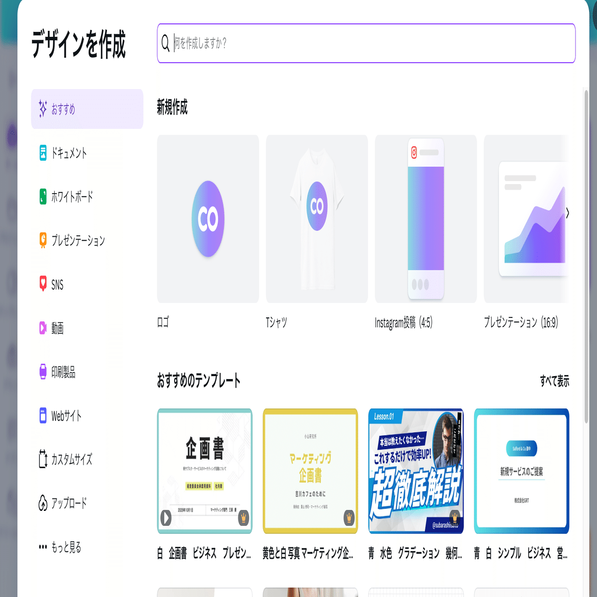 アカウント登録したら、ホーム画面左上にある[+デザイン作成]するボタン押下すると、以下画面が出てきます。