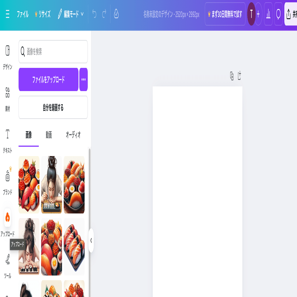 先ほど、手順1で生成し、ダウンロドした画像を、canvaにアップロードします。
